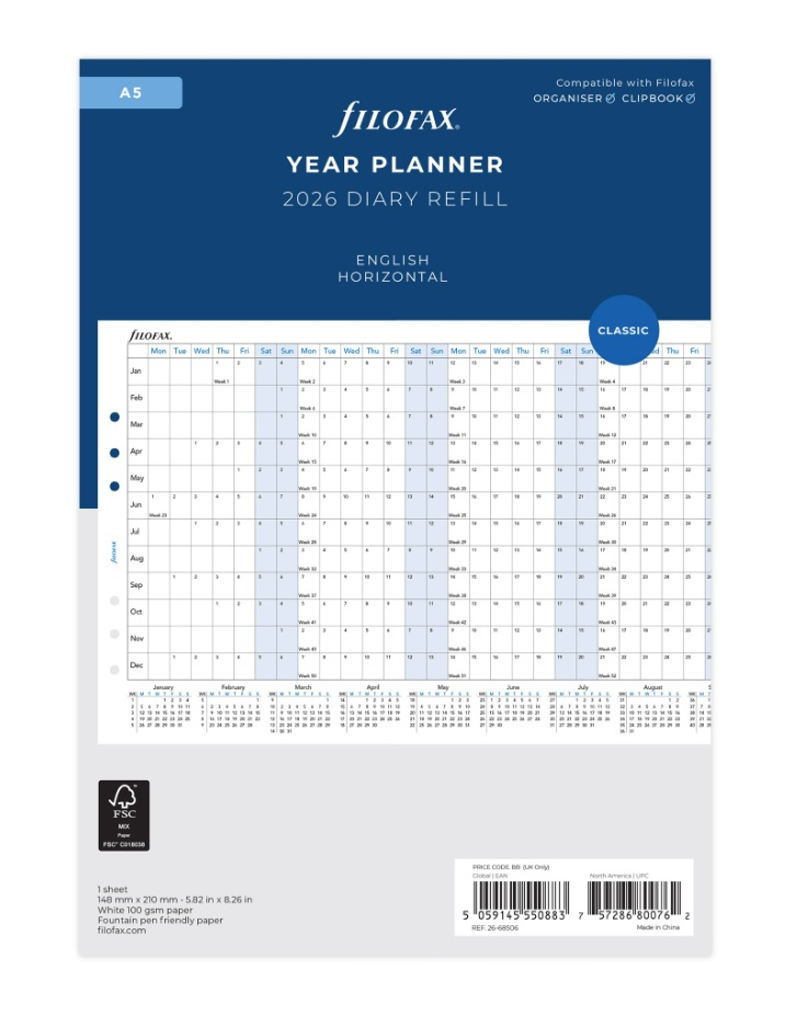 Parametry zboží - Filofax horizontální kalendář 2026 plánovací AJ - A5