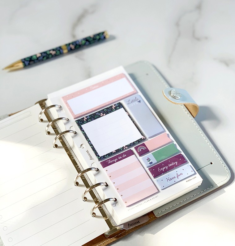 Sada přemístitelných lepicích poznámkových papírků z kolekce Garden zaručeně zpestří vaše poznámky. Obsahuje poznámkový bloček linkovaný, nelinkovaný a vertikální, bloček na seznam úkolů a čtyři bločky vodorovný záložek. Bločky jsou v barevné kombinaci růžové, modré, fialové a zelené. Sada je vhodná pro diáře Filofax A5 nebo Osobní, Clipbook A5 nebo Osobní nebo plnitelný zápisníku Filofax Notebook A5 a A4. Rozměry 164 mm x 95 mm.