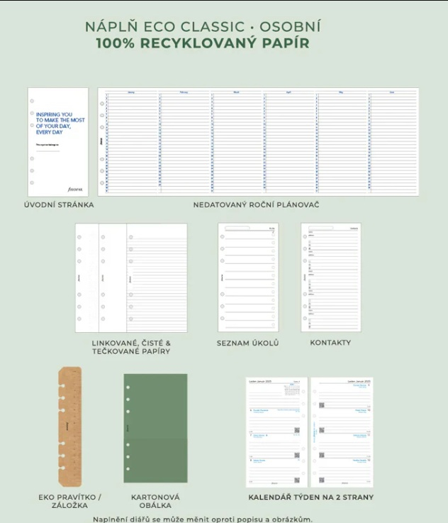 Obal z umělé kůže je vyroben ze 100% spotřebitelského recyklovaného plastu s decentní texturou zrnité kůže. Uvnitř najdete náplň Eco Classic s FSC certifikovaným 80g papírem, který je vhodný i pro plnicí pera. Výměnný obsah zahrnuje kalendář, poznámkové listy, úkoly, kontakty i praktické pravítko a záložku. Velikost náplně Personal - formát papíru 95 x 171 mm.