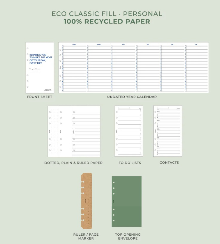 Obal z umělé kůže je vyroben ze 100% spotřebitelského recyklovaného plastu s decentní texturou zrnité kůže. Uvnitř najdete náplň Eco Classic s FSC certifikovaným 80g papírem, který je vhodný i pro plnicí pera. Výměnný obsah zahrnuje kalendář, poznámkové listy, úkoly, kontakty i praktické pravítko a záložku. Velikost náplně Personal - formát papíru 95 x 171 mm.