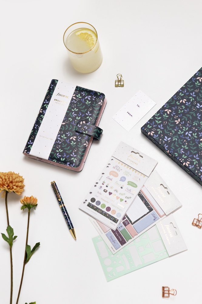 Limitovaná dárková sada diáře Filofax Garden ve velikosti A6 s kuličkovým perem a dalšími doplňky. Dodáváno v luxusní krabičce ve stejném designu jako diář.