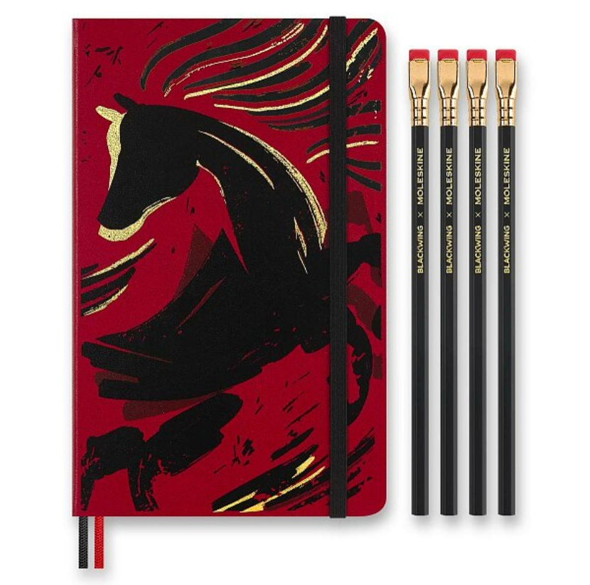 Moleskine Horse Wood sada zápisníku a 4 tužek - zápisník velikosti A5 a čtyři grafitové tužky Blackwing tvoří limitovanou edici inspirovanou rokem Ohnivého koně, která podporuje kreativní myšlení a zachycení nápadů kdykoliv během dne.