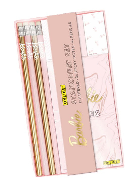 Online Barbie Stationery Set obsahuje vše, co potřebujete k rychlému zápisu nápadu, nákupního seznamu nebo tajného vzkazu. Pět věcí v jednom balení, které říká „mám to pod kontrolou“ – samozřejmě v růžové.