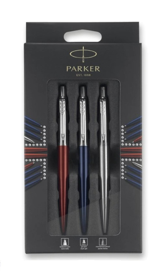 Sada obsahuje kuličkové pero Parker Jotter Kensington Red CT, gelové kuličkové pero Parker Jotter Royal Blue CT a mechanickou tužku Parker Jotter Stainless Steel CT. Kuličková pera mají lakované barevné tělo, horní část je vyrobená z broušené nerezové ocele. Mechanická tužka má celé tělo z broušené nerezové ocele. Doplňky jsou pochromované, s leštěnou úpravou. Kuličková pera jsou opatřena stiskacím mechanismem a jsou dodávána s náplní. Mechanická tužka má také stiskací mechanismus a je dodávána s tuhou o síle 0,5 mm. Dodáváno v dárkové krabičce.