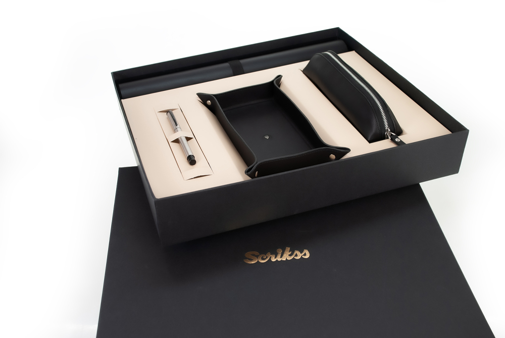 Černé provedení působí profesionálně a zapadne do moderní kanceláře i domácí pracovny. Set byl vyroben značkou Scrikss, která staví na řemeslném zpracování a funkční eleganci.