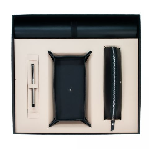 Set je vyroben z pevné pravé kůže, která při pravidelném používání získává přirozený charakter. Kožená podložka vymezuje pracovní plochu a zpříjemňuje psaní, odkládací miska pomáhá udržet drobnosti na jednom místě a pouzdro chrání psací potřeby při přenášení i uložení.
