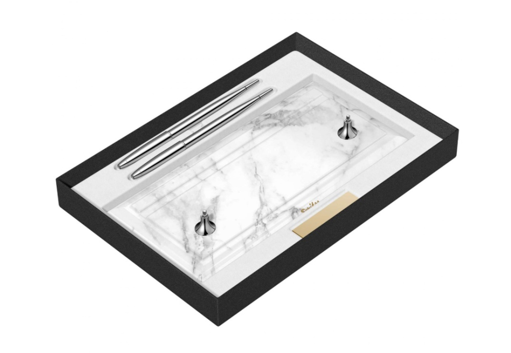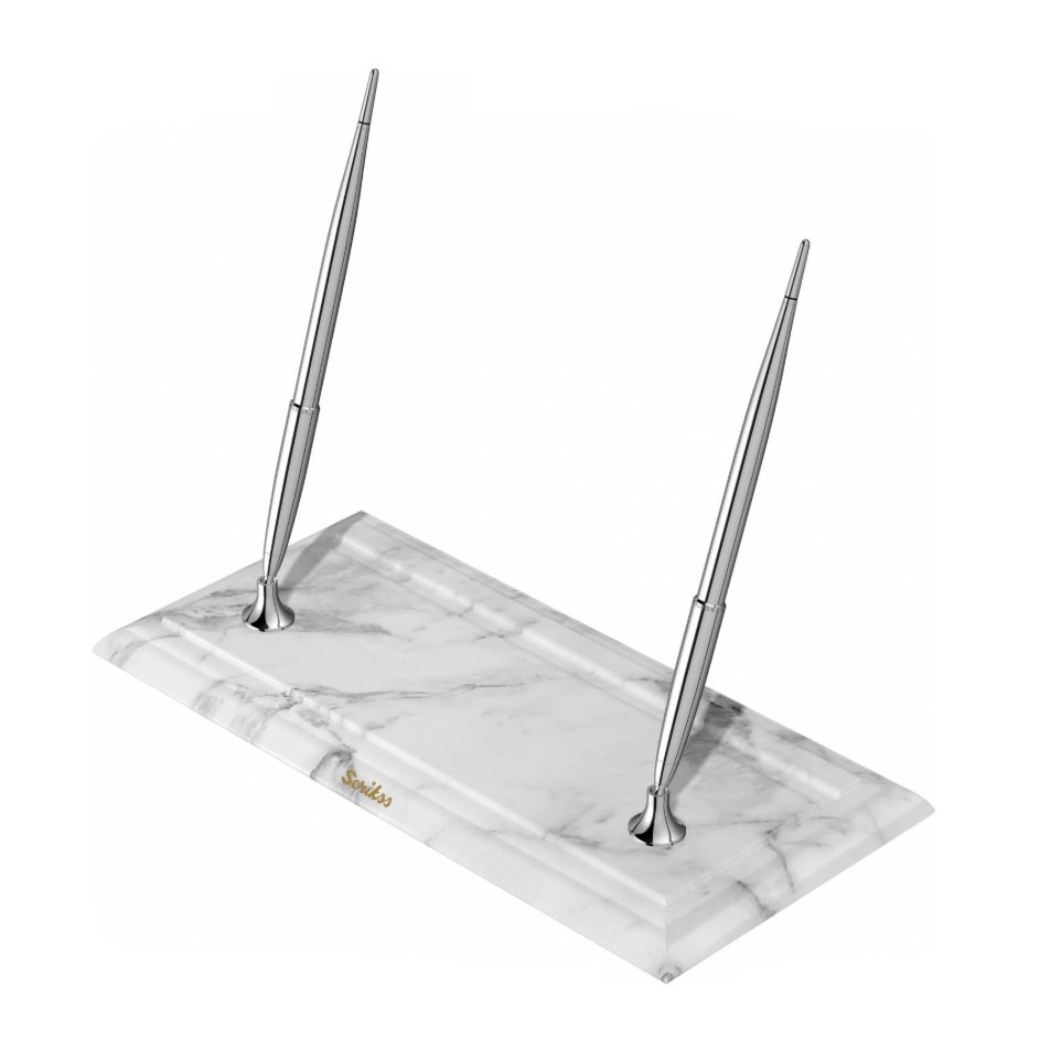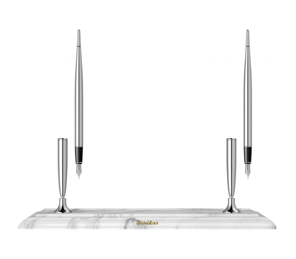 Elegantní a moderní stolní set plnicích per se základnou z bílého mramoru. Pera jsou vyrobena z mosazi a pokovená chromem. Mají nerezový hrot pokovený chromem s iridiovou špičkou v šířce M - střední.